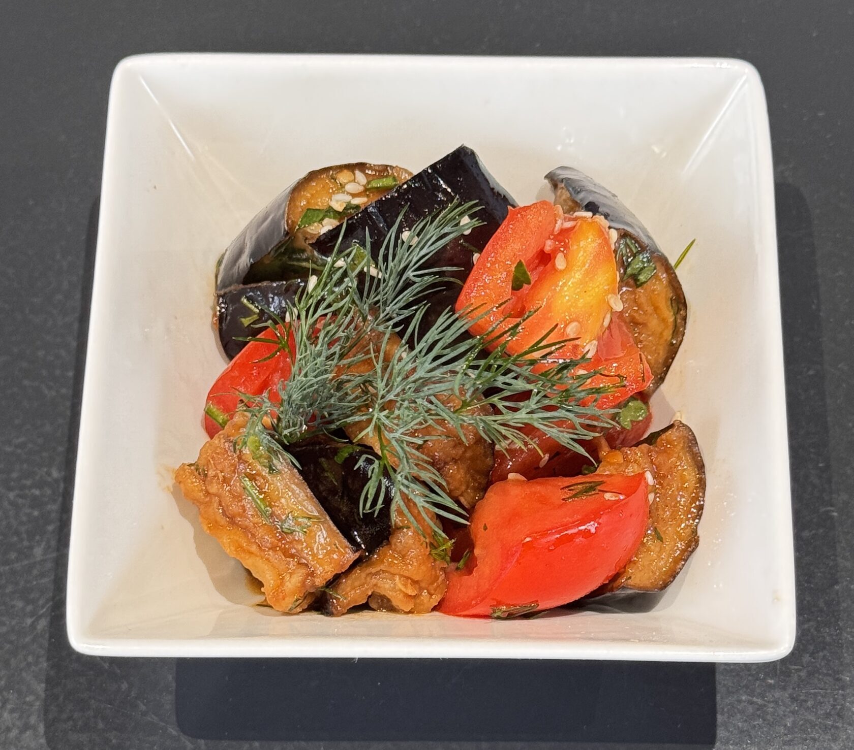баклажаны, крахмал, специи, соус терияки, соус соевый, масло растительное, помидоры свежий, кунжут